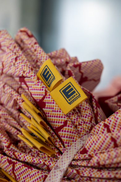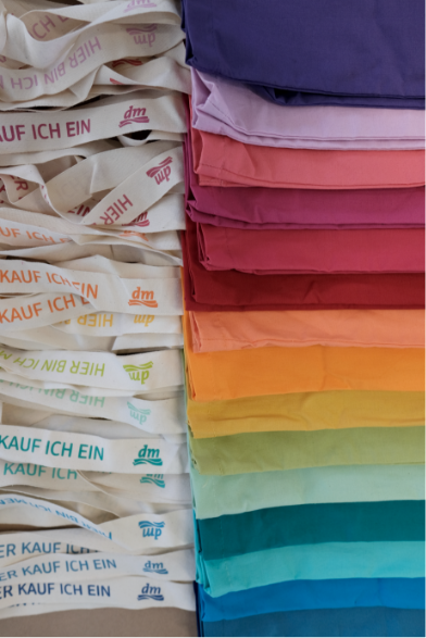 Eine Tasche, uni-bunt und die Ecken abgerundet - so entwarf Sina einst für unseren ersten Kooperationspartner die erste Biobaumwolltasche. Sie war der Grundstein für unser Projekt und Beginn eines großen Erfolgs: unserer Taschenproduktion. Niemand glaubte, dass man in Deutschland wieder in großen Stückzahlen Textilien wertschöpfen kann. Heute, über zehn Jahre später, dürfen wir sagen: Es geht. Die Biobaumwolle aus einer Kleinbauern-Kooperative in Tansania, gesponnen, gewoben und gefärbt in NRW und anschließend „eingetütet“ in Textiltown. Heute freuen wir uns über langjährige Partnerschaften mit EDEKA, tegut & dm und deren Kunden über saubere Taschen, hergestellt in Augsburg.