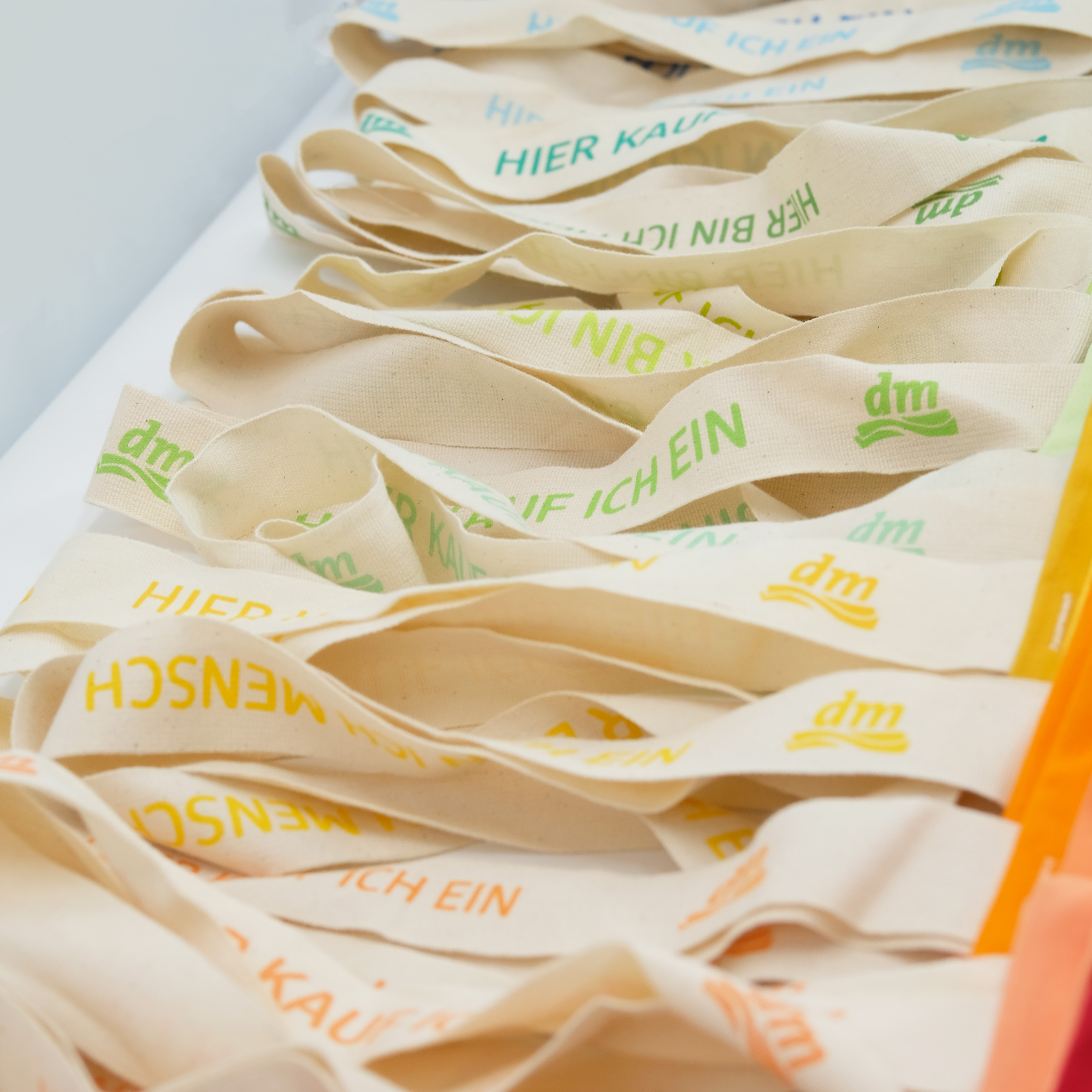 Über zehn Jahre haben wir für die DM Drogeriemärkte die Ikone der Stofftaschen hergestellt. Nahezu jeder kennt die bunten Taschen mit den naturfarbenen Henkeln und dem DM Slogan. Wir sind stolz, diesen absoluten Klassiker entworfen, entwickelt und produziert zu haben.