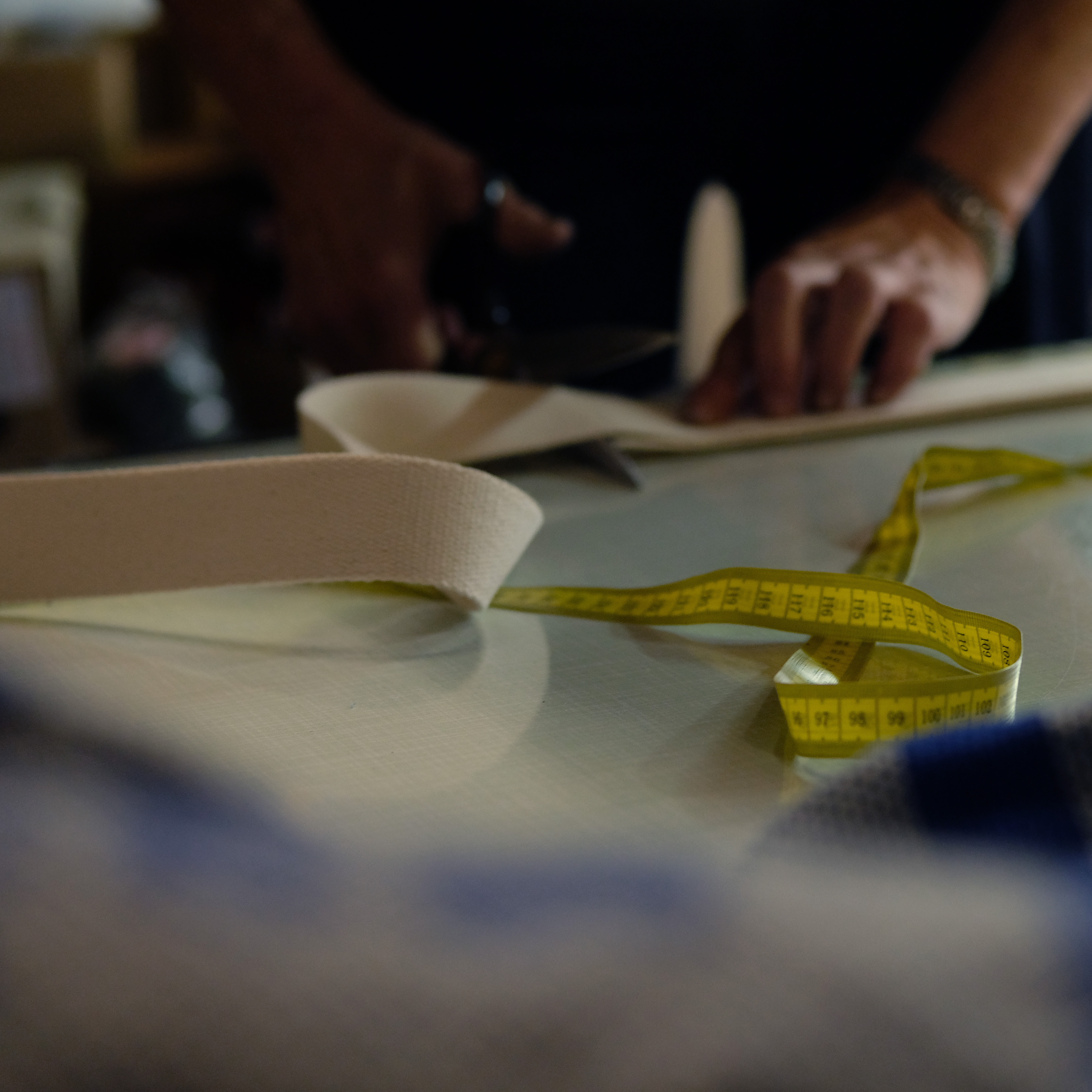 Damit Material sinnvoll upgecycelt werden kann, ist viel händischer Zuschnitt von Nöten. Dennoch machen wir es gerne: Denn am nachhaltigsten ist bestehendes Material.
