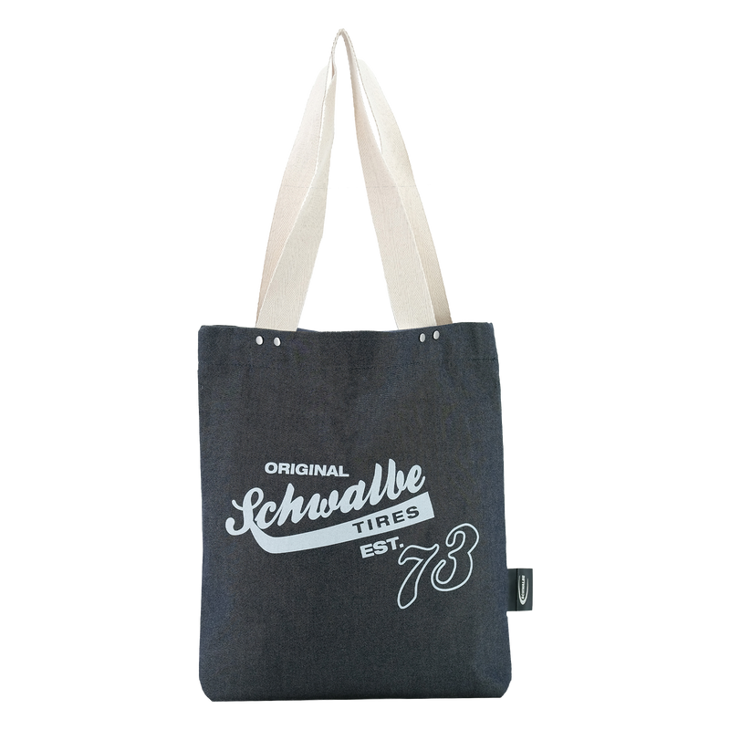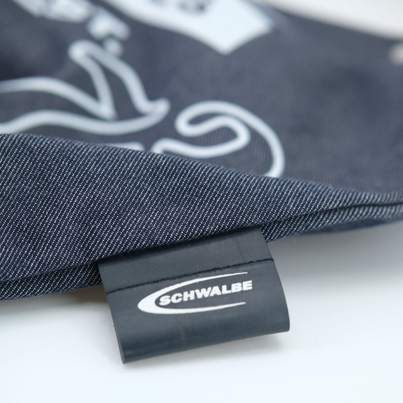 Die Aufgabe: 10.000 Taschen für SCHWALBE, den deutschen Hersteller für Fahrradreifen und -schläuche. Aus nachtblauem Denim, mit Bodenfalte für das nötige Volumen, weißem Siebdruck als Markenzeichen - und einem Detail, das nur bei Schwalbe wirklich Sinn ergibt: ein Etikett aus altem Fahrradschlauch, bedruckt mit dem Schwalbe-Logo. Dazu Henkel in Fischgrätbindung für eine Haptik, die sich vom Standard-Werbebeutel sofort unterscheiden lässt. Und weil es Schwalbe nicht nur um eine Tasche, sondern um ein glaubwürdiges Markenprodukt geht: inklusive zertifizierter Dokumentation aller Nachhaltigkeitskriterien.